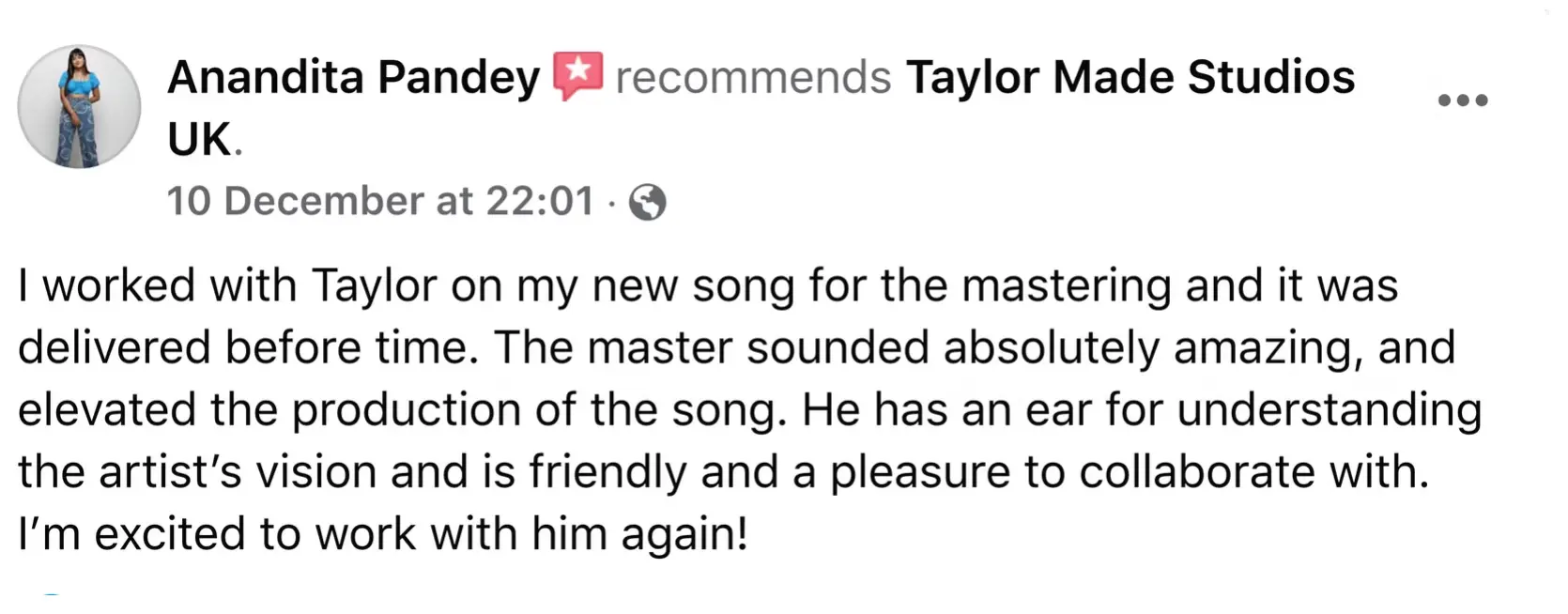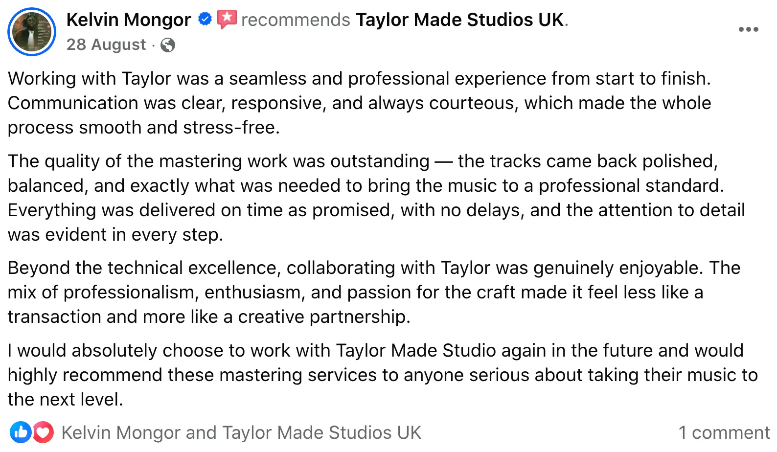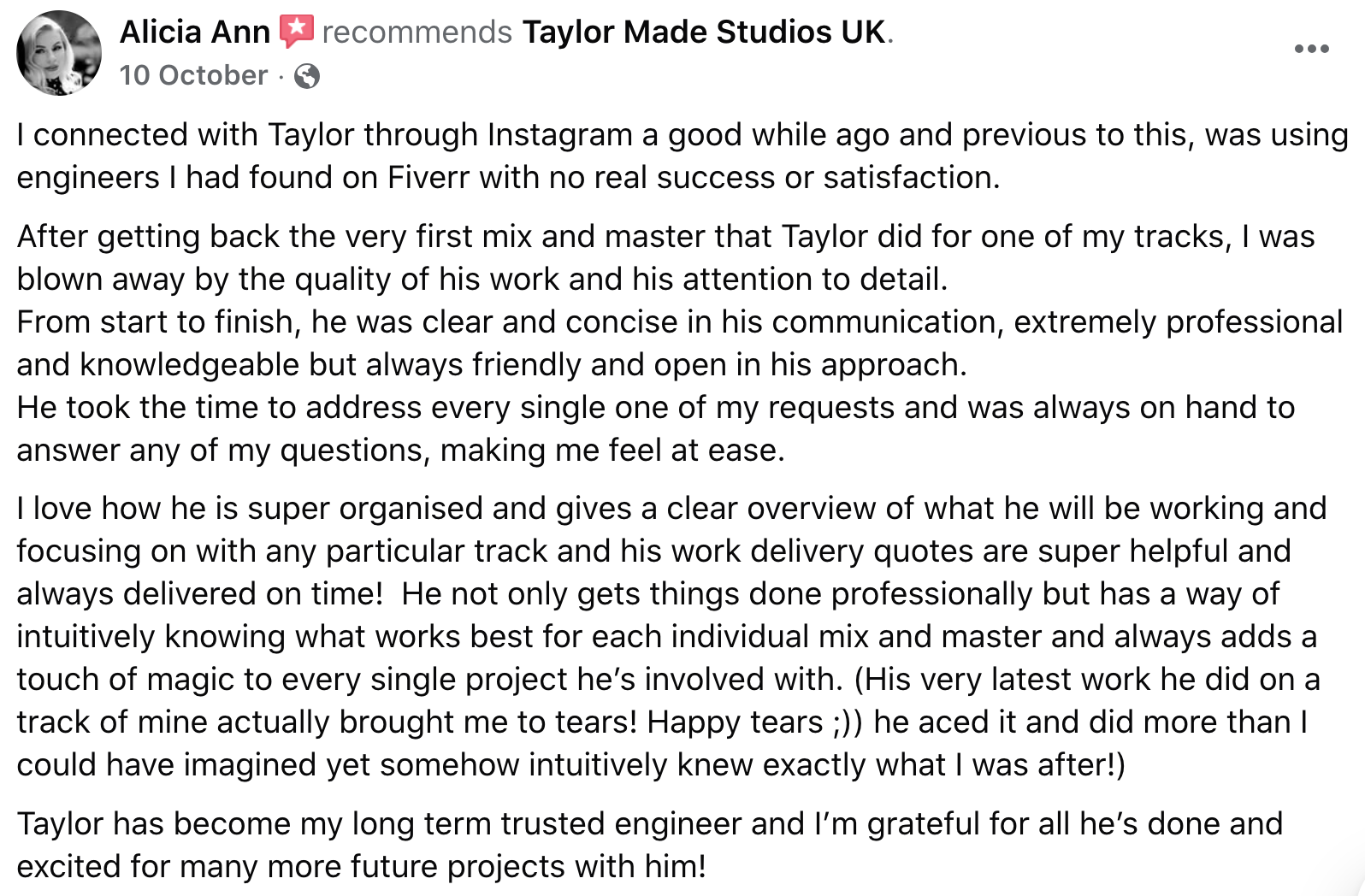 Feedback & Revisions: Taylor is always open to feedback and happy to fine-tune the mix until you're completely satisfied.